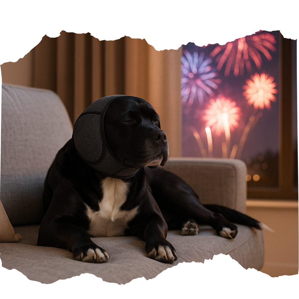Die PfötchenLiebe® Ohrenhaube wurde entwickelt, um Hunde mit Geräuschempfindlichkeit zu beruhigen – besonders an Silvester, bei Gewitter oder lauten Alltagsgeräuschen.